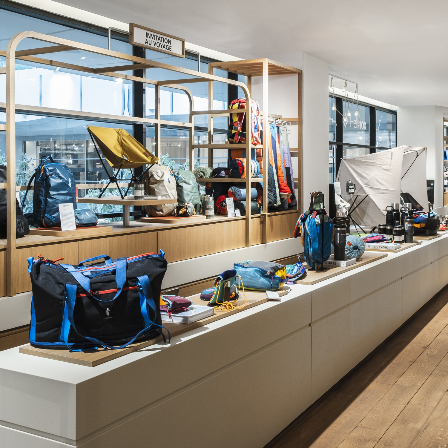 Situé au deuxième étage du Bon Marché Rive Gauche, notre espace bagagerie est baigné de lumière naturelle. L'aménagement, inspiré des grands halls de gare parisiens, crée une atmosphère propice au voyage. Une vaste zone d'essai permet de tester la maniabilité des valises sur différents types de sols.