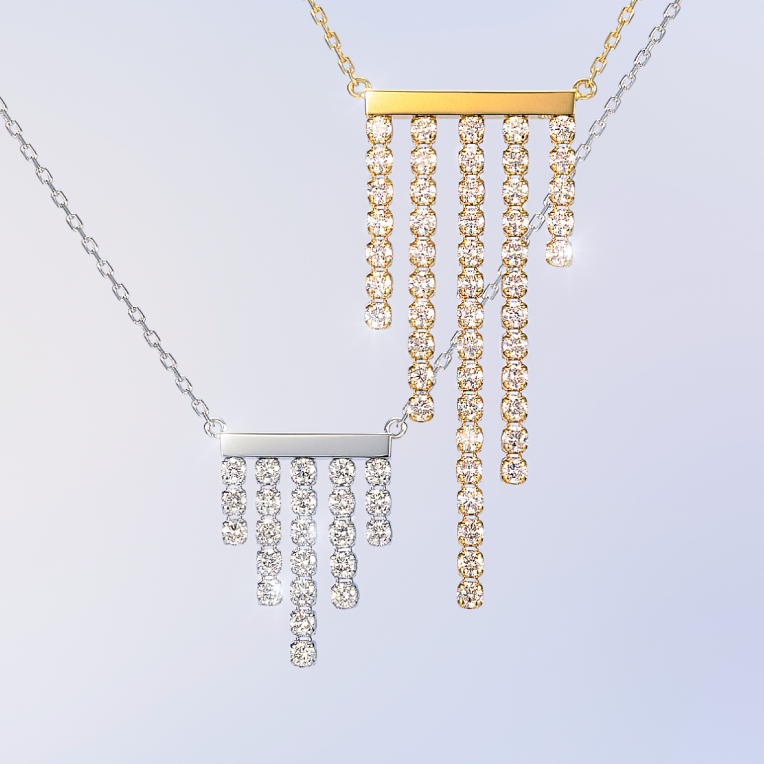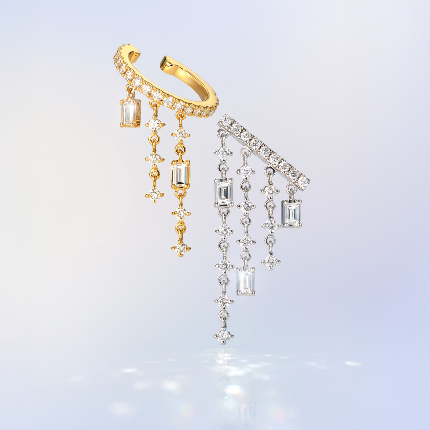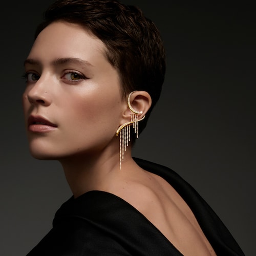 La série « chandelier » s'inspire des lustres qui émettent un éclat sophistiqué. Le mariage des fines chaînes en or serties de diamants, émet un scintillement délicat et gracieux. Chaque mouvement fait ainsi naître une sensation de douceur et d'élégance.
