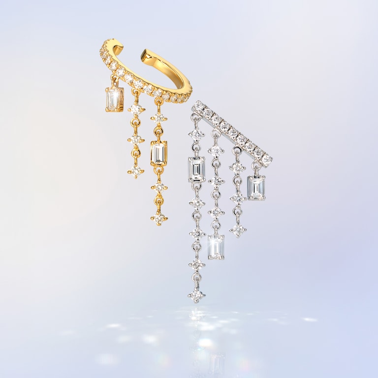Deux tailles de diamants différentes, la taille baguette et la taille brillant rond, scintillent avec une élégance gracieuse, comme de la soie délicatement tissée. Le balancement raffiné et le doux éclat de la série « chandelier sway » apportent une touche lumineuse et procurent une sensation de douceur à celle qui la porte.