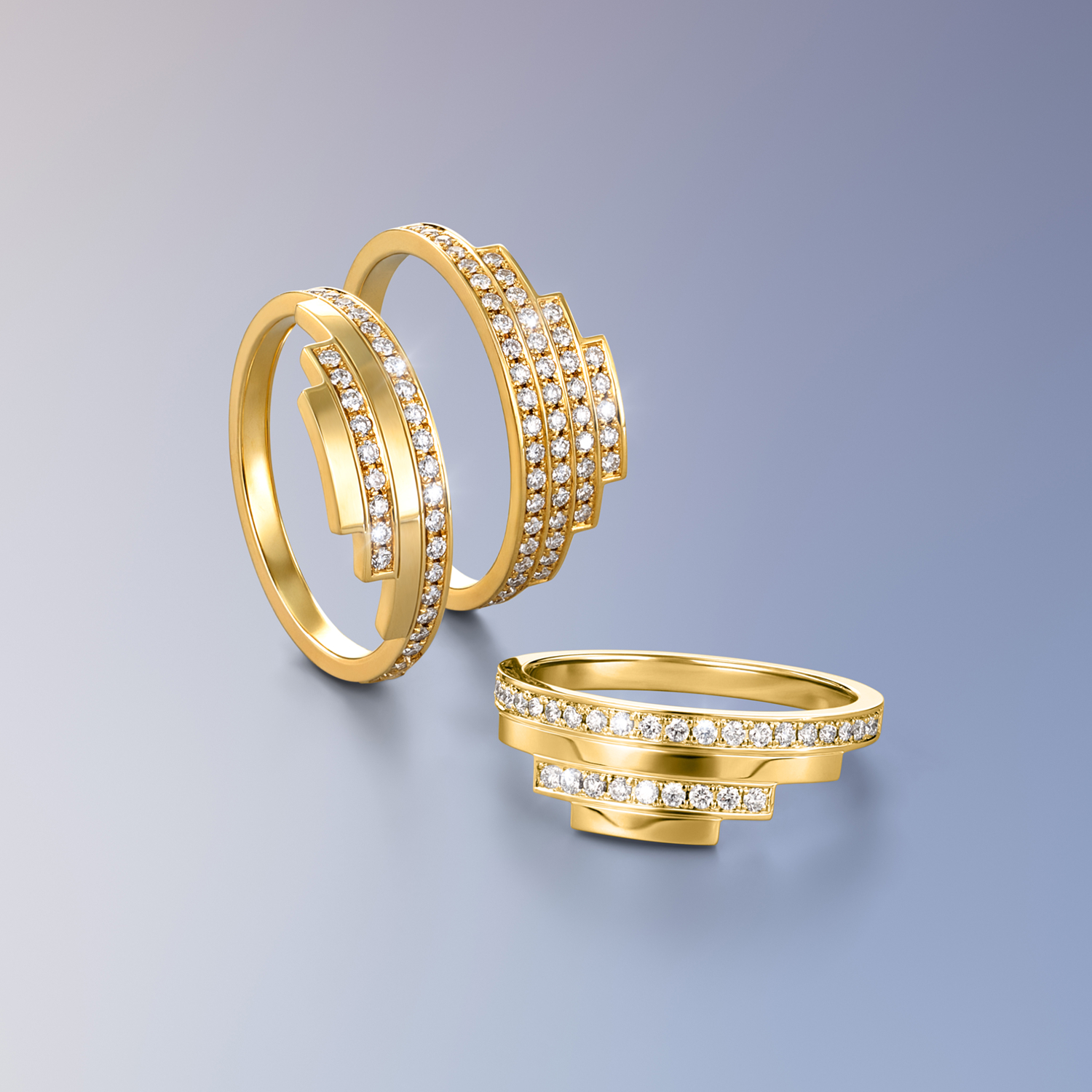 Misant sur de sublimes jeux d’ombres et de lumières, la série « chandelier Layered » allie à la fois charme et caractère. Les diamants superposés, mélangés à un or étincelant, représentent alors un lustre structuré et sophistiqué.