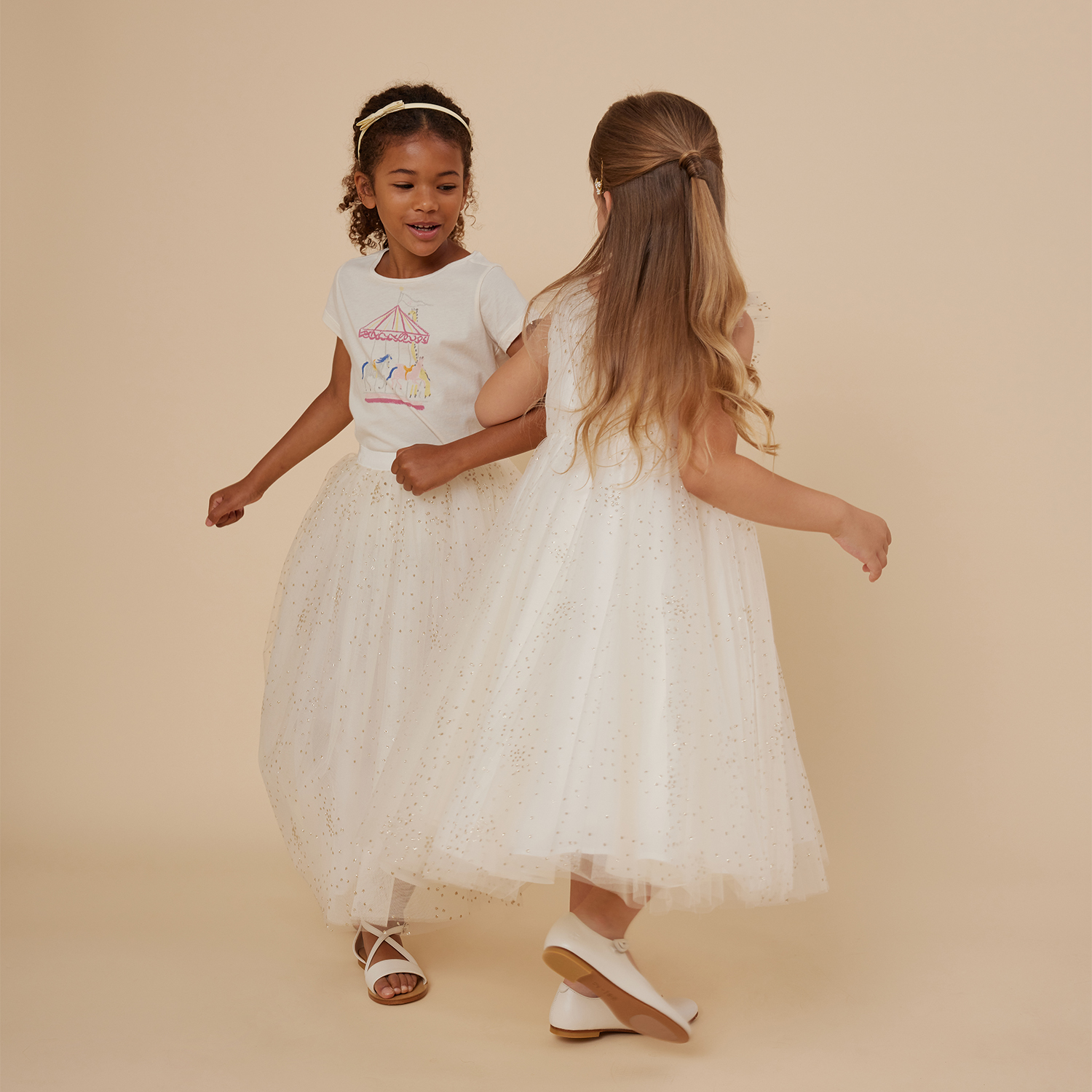 Jolies robes et blouses délicates : Bonpoint imagine une sélection de pièces tout en élégance pour les grandes occasions. Des couleurs douces et joyeuses s’invitent sur les robes Terrie ou Comtesse. Le blanc est décliné dans une popeline délicatement smockée ou dans une tulle brodée de paillettes. Pour parfaire chaque tenue, les cardigans délicatement brodés à la main offrent une touche de chaleur et d'élégance lors des soirées fraîches.