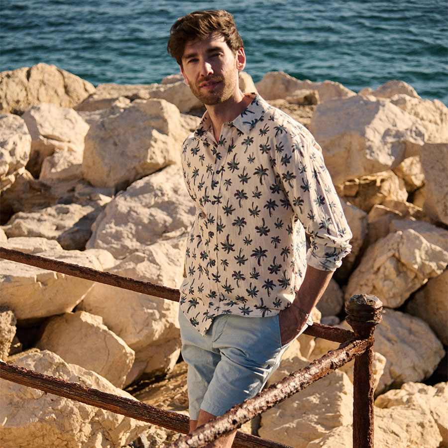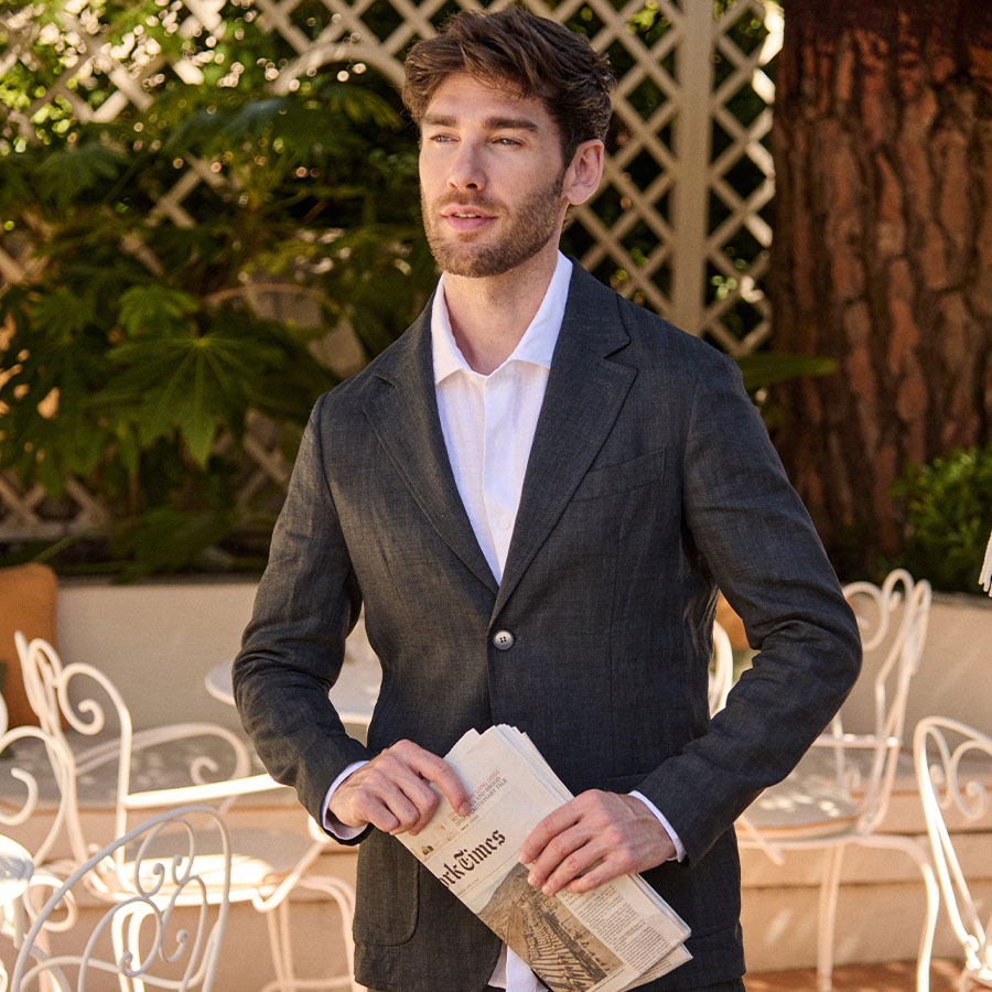 En contraste, la ligne Riviera Style célèbre la décontraction ensoleillée et les inspirations balnéaires. Le lin y tient une place centrale, utilisé pour des chemises à col cubain, des pantalons souples ou encore des vestes sahariennes. Ces pièces s'habillent d'une palette douce et solaire, du bleu azur au rose dragée. Un mélange de coton, lin et élasthanne vient enrichir la collection d’une nouvelle matière fluide, idéale pour structurer une silhouette décontractée. Des imprimés corail pastel y ajoutent une touche de fraîcheur et d’évasion.