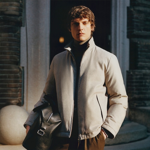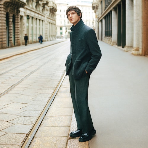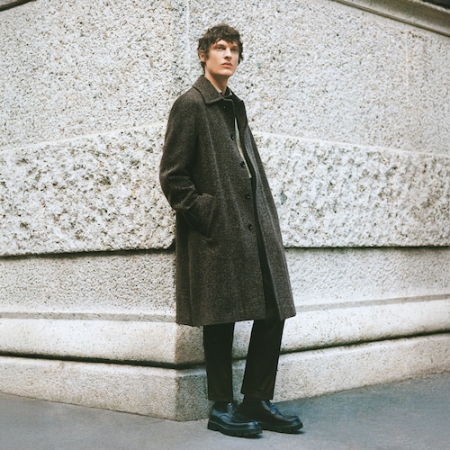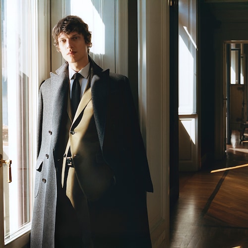 La nouvelle collection imagine un vestiaire masculin où tradition et modernité s’équilibrent. Les silhouettes se distinguent par des coupes nettes et des volumes revisités, jouant sur le contraste entre pantalons ajustés et manteaux amples. Les matières, rigoureusement sélectionnées, soulignent l’excellence artisanale : laines italiennes, cachemire double face, cuir souple ou encore tricots aux finitions dégradées.