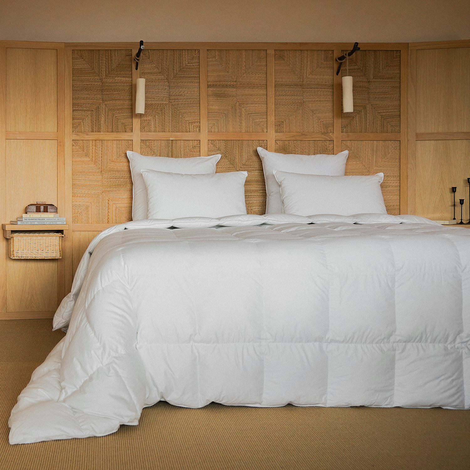 Avec un garnissage allégé à 120 g/m², elle assure une excellente circulation de l’air et une régulation thermique naturelle. Le corps est enveloppé sans être alourdi, pour un sommeil fluide, apaisé, même lors des nuits les plus chaudes. Son garnissage, composé à 70 % de duvet et 30 % de plumettes d’oie, est travaillé dans les ateliers du Mans selon un savoir-faire maîtrisé à chaque étape : lavage, stérilisation, triage, assemblage. L’enveloppe en satin de coton, d’une grande douceur, accentue cette impression de légèreté et parachève une expérience nocturne tout en finesse.