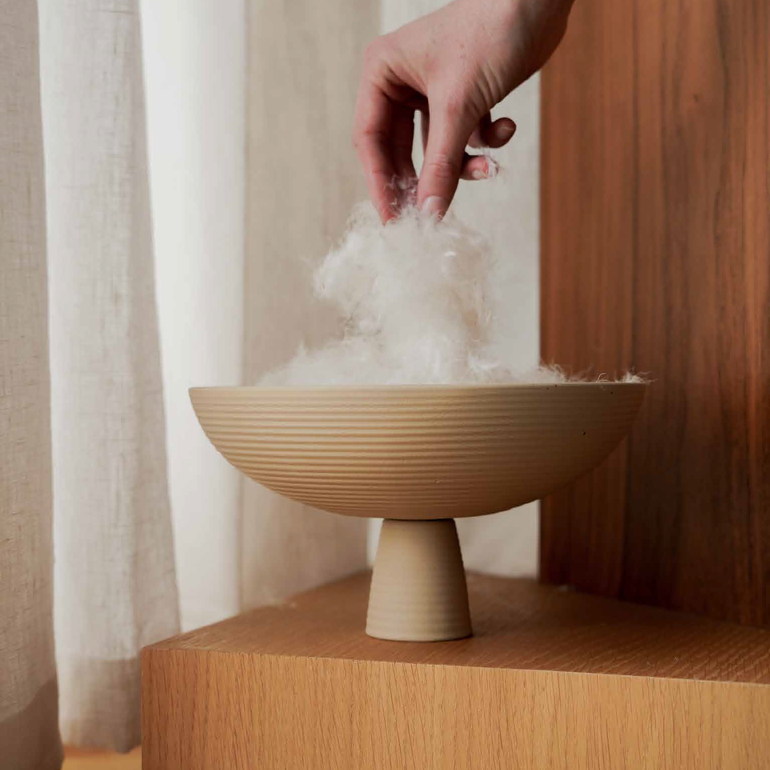 La manufacture Drouault utilise également des matières alternatives au duvet telles que le garnissage synthétique, composé à 60 % de fibres polyester recyclées, ou encore le coton biologique, le tencel ou la laine.