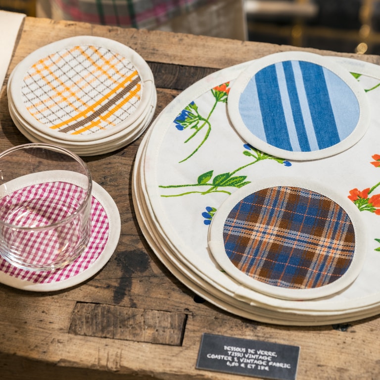 Tissus dormants, vintage ou en fin de série deviennent nappes, serviettes, tabliers, accessoires ou objets du quotidien, fabriqués en circuit court dans l’atelier roubaisien de la marque. Chaque création est montée à la main, à partir de matières naturelles, sourcées en France, et revalorisées dans une démarche sans gaspillage.