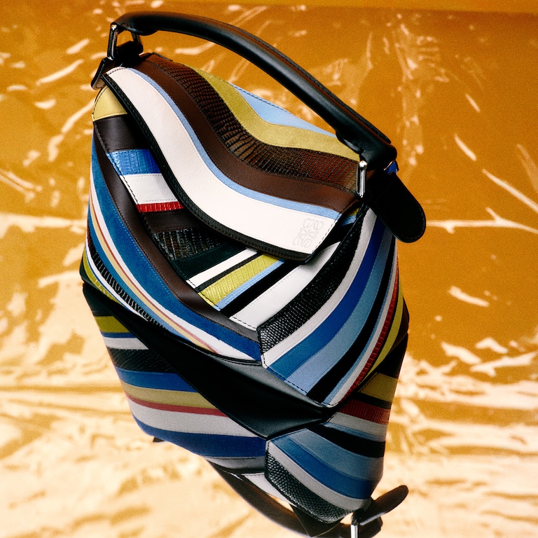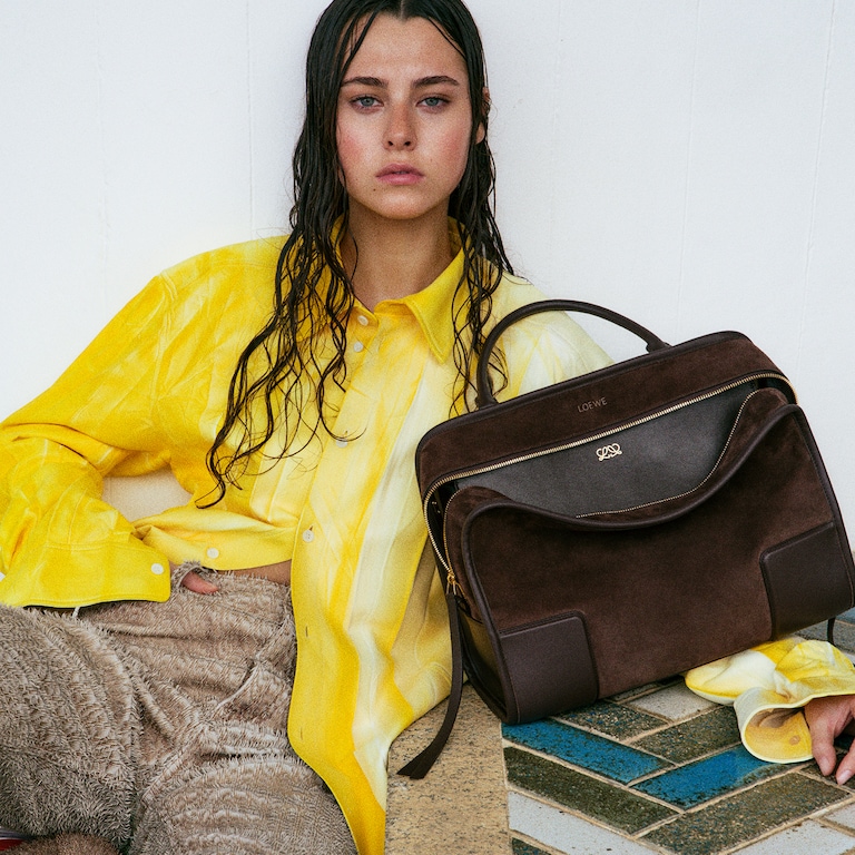 La richesse des matériaux vibrants de la collection se reflète dans les nouveaux sacs et chaussures. Pour marquer le 180ème anniversaire de LOEWE, l'Amazona 180 se présente comme une réinterprétation de l'icône de la Maison, désormais sous la forme d'une silhouette souple et brillante en cuir doux, portée ouverte. Aux pieds, des formes sinueuses se déclinent dans une palette audacieuse. L'escarpin Origami à rabat, inspirés du papier, côtoie la bottine translucide Emily aqua et la sneaker Grip, dont le design évoque les chaussures d'escalade.