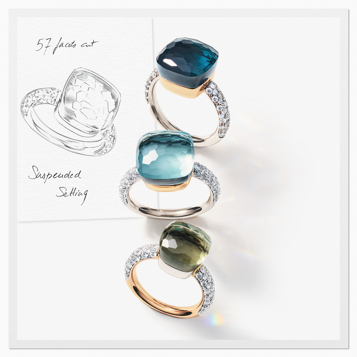 Laisser la pierre dans sa forme brute est une autre façon pour la Maison d'oser aller à contre courant de l'uniformité. Qu'il s'agisse de diamants ou de pierres de couleur, Pomellato met en exergue le caractère unique de chaque pierre.