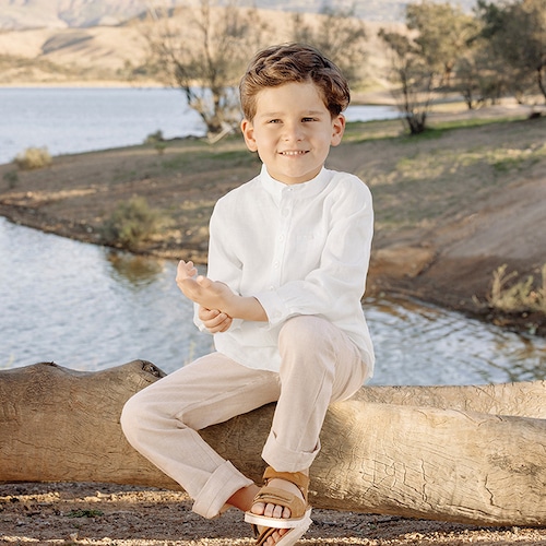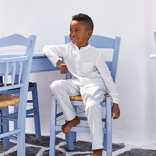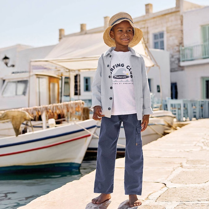 Pour les garçons, le vestiaire se décline en tons kaki, bleu sauge, sable et marine. Les coupes sont précises, les matières légères, les détails maîtrisés, composant une allure raffinée, à la fois sobre et naturellement élégante.