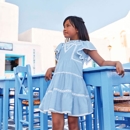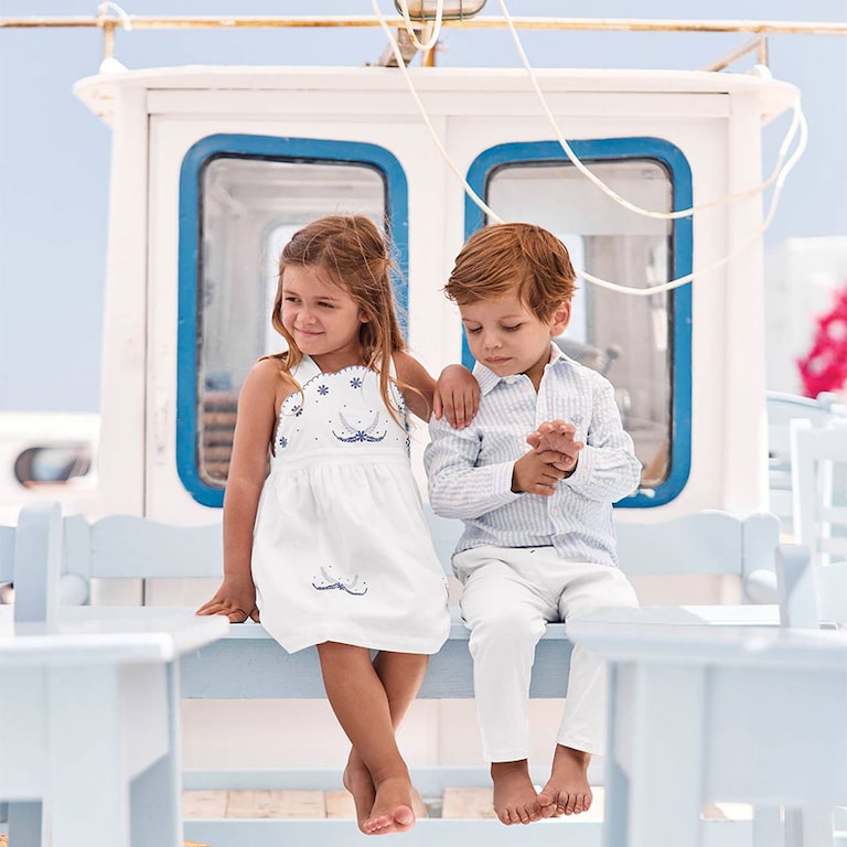 Pour les filles, une palette subtile de bleu azur, de blanc éclatant et de nuances solaires esquisse des silhouettes empreintes de grâce. Robes aériennes, tulles vaporeux et jeux de volants traduisent une élégance tout en légèreté.