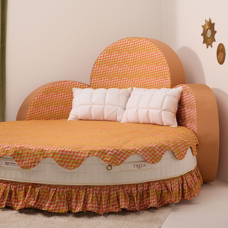 Tréca, marque française spécialiste de la literie haut de gamme depuis 1935, s'associe au collectif parisien Uchronia, référence pluridisciplinaire en architecture et design, pour une collaboration aussi audacieuse qu'inattendue. Ensemble, ils lancent une invitation à l'extravagance avec Marguerite : un lit rond, ultra-confortable, directement inspiré de l'imaginaire des nuits 70's. Sa tête de lit aux imprimés hypnotiques jaune, vert pomme et orange en fait une pièce à part entière, où créativité débridée et esthétique singulière se rencontrent.