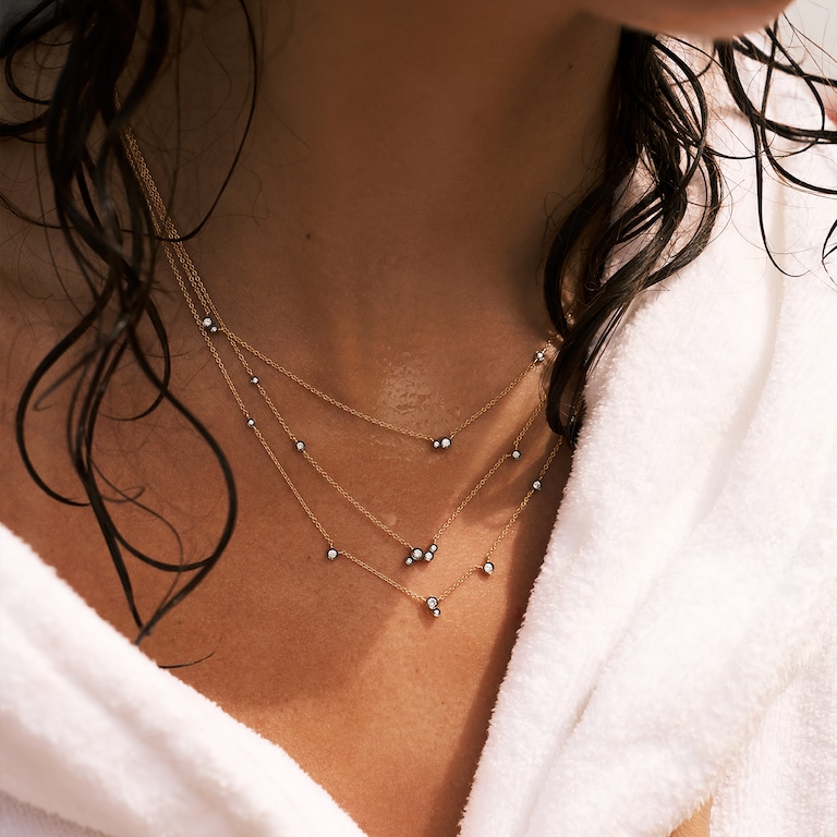 Hommage au ciel nocturne des Cyclades, Céleste fait scintiller l’or et les diamants tels des constellations suspendues. Une collection lumineuse et intemporelle.