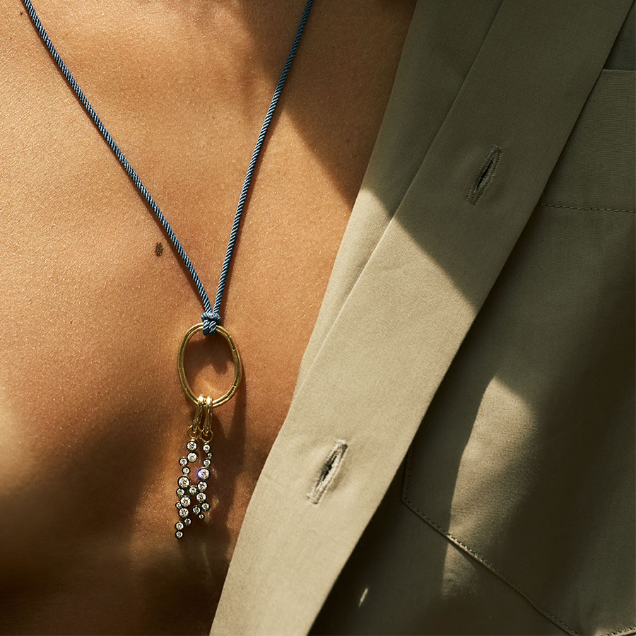 La collection Σigma célèbre les étés grecs à travers un jeu de lumière, de texture et de mémoire. Associant or, diamants et cordons colorés, elle invite chacun à composer des bijoux personnels, témoins de moments précieux et d’instants à conserver.
