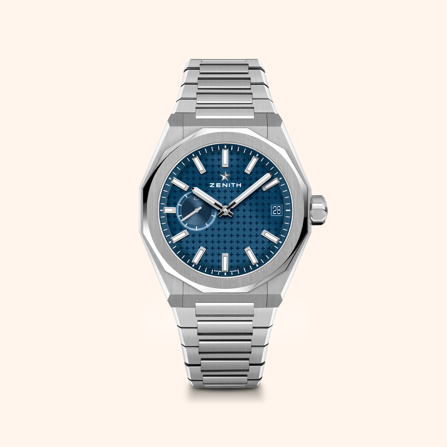 Rappelant le ciel nocturne au-dessus d'une ville animée qui ne dort jamais, la DEFY Skyline est dédiée à ceux qui suivent leur lumière et forgent leur propre chemin dans leur voyage vers leur étoile. À la fois géométriquement structuré et empreinte de fantaisie céleste, le cadran étoilé à la finition soleillée, est agrémenté d'un motif parfaitement aligné. Celui-ci se compose d'étoiles à quatre branches gravées, une réimpression moderne du logo Zenith « double Z » des années 1960.