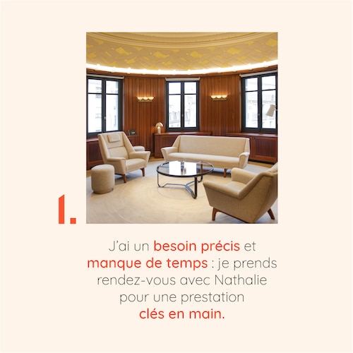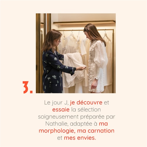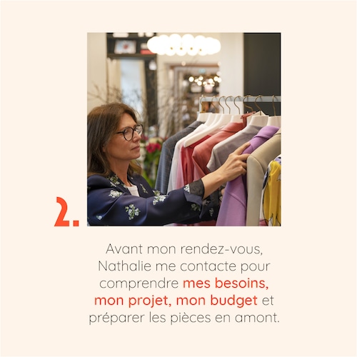 Chaque rendez-vous commence par un entretien téléphonique pour analyser vos besoins, votre morphologie, votre carnation de peau et votre budget. Nathalie prépare ensuite une sélection personnalisée que vous découvrirez et essayerez dans l'intimité des Salons Particuliers.