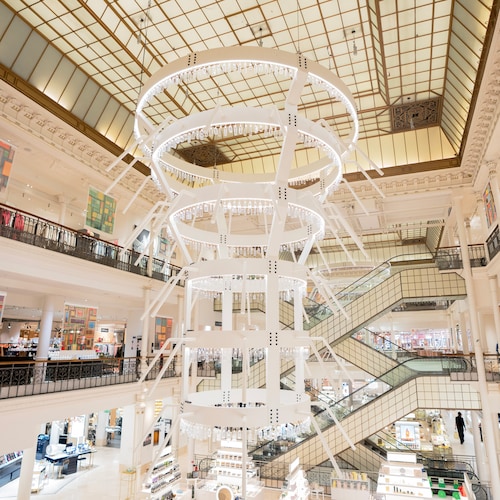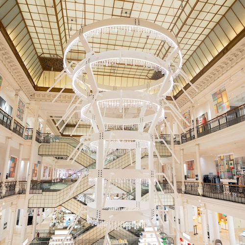 Autour de l’escalator central, Song Dong dévoile deux chandeliers monumentaux, suspendus sous les verrières et composés de six anneaux en acier, ornés de bouteilles éclairées de blanc, évoquant les pampilles scintillantes d’un lustre. Le long des garde-corps des deux trémies, l’artiste déploie un ensemble de rideaux reprenant son motif emblématique de fenêtres colorées.