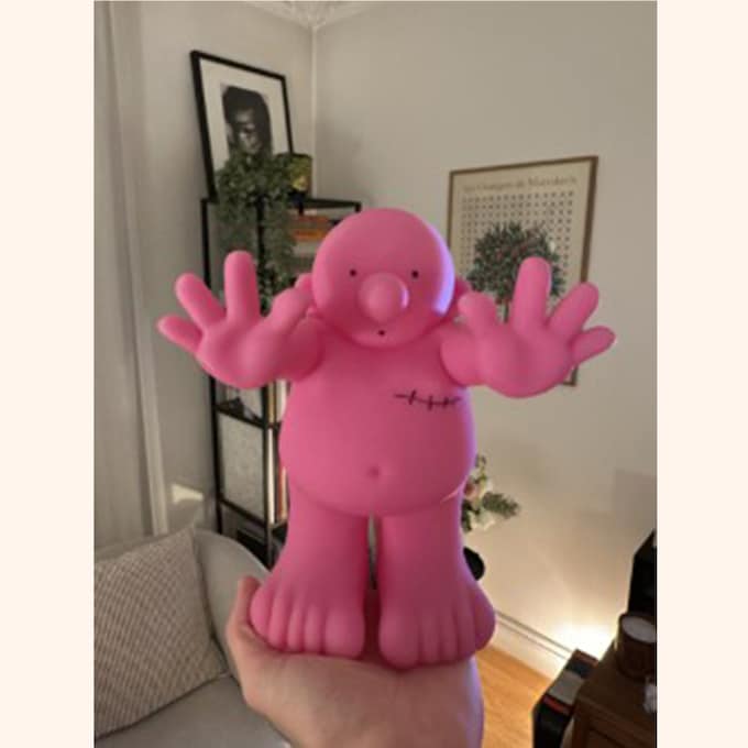 Il s’agit d’un mignon créé par Philippe Katerine pour l’expo Le Mignonisme de 2022. J’ai eu la chance de travailler avec lui pendant toute la préparation de l’événement, et il m’a gentiment dédicacé cette figurine avec sa touche d’humour personnelle évidemment. Elle me regarde maintenant tous les jours depuis le haut de ma bibliothèque.